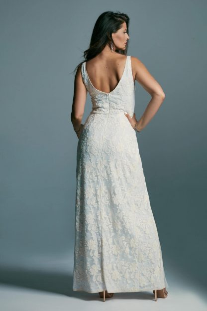 Zmierz wysokość tyłu od środka – od najgłębszego punktu dekoltu do talii. Jeśli suknia ma zabudowane plecy lub stójkę, to od najbardziej wystającego kręgu na karku do talii.