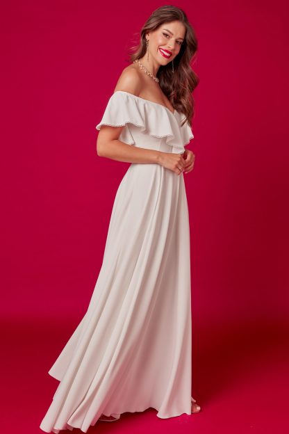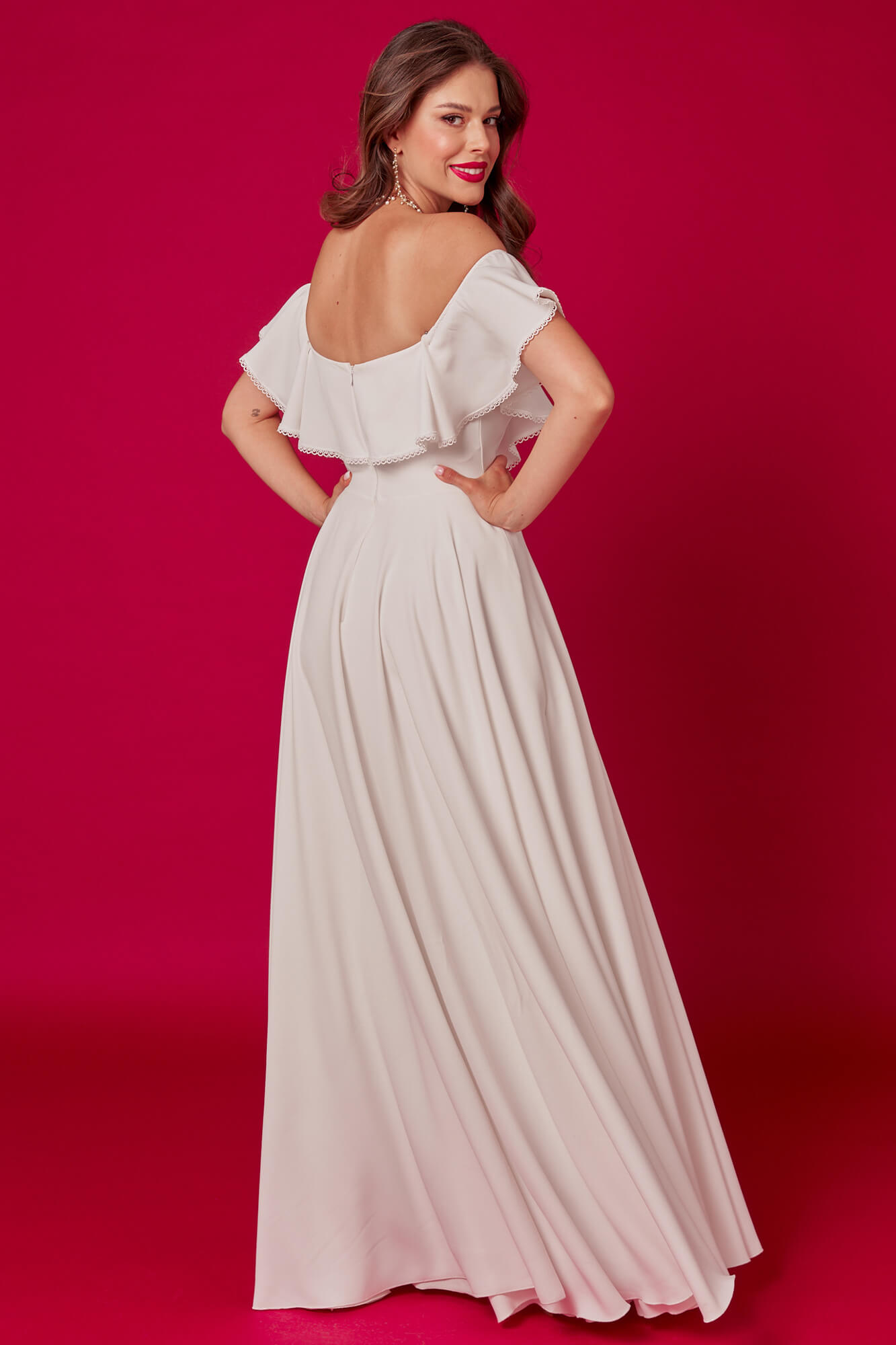 Zmierz połowę dekoltu od środka dekoltu z przodu, do suwaka / kręgosłupa z tyłu, przez rękę, po linię sukienki zsuniętej z ramion.