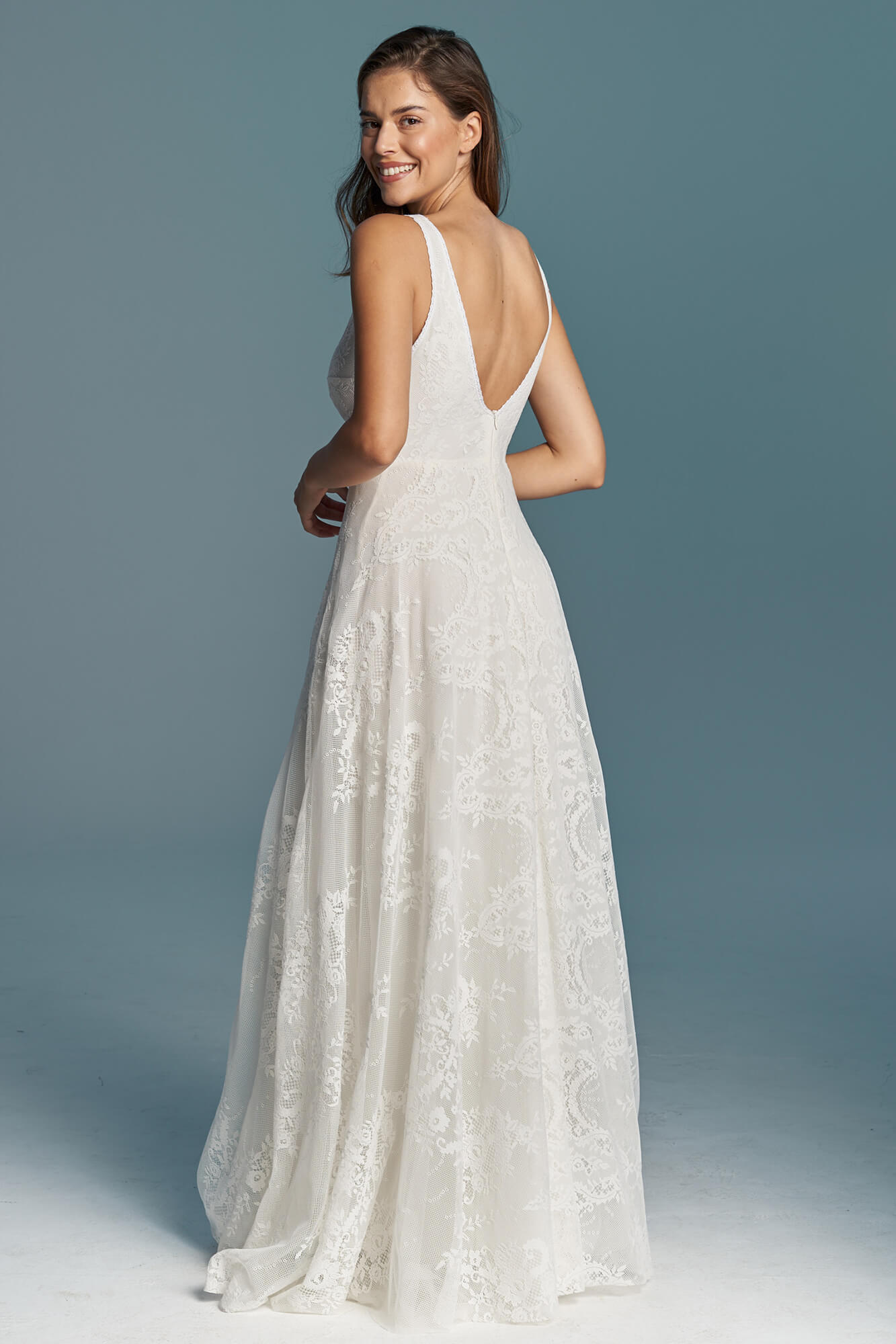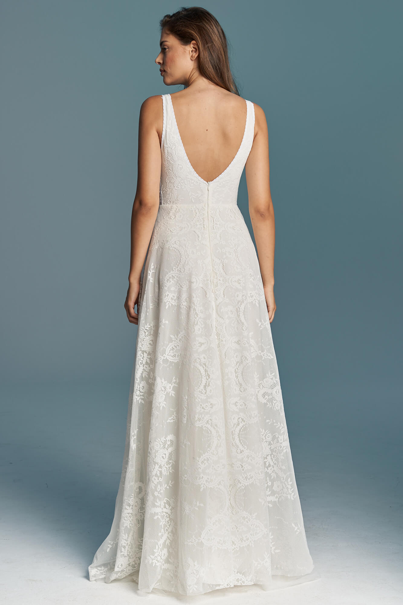 Zmierz wysokość tyłu od środka – od najgłębszego punktu dekoltu do talii. Jeśli suknia ma zabudowane plecy lub stójkę, to od najbardziej wystającego kręgu na karku do talii.