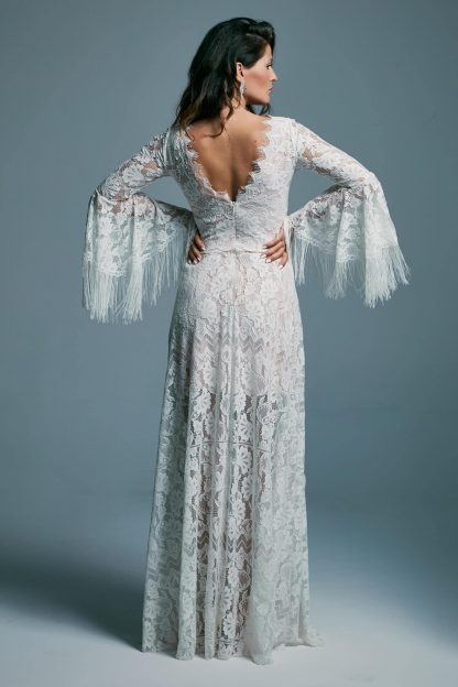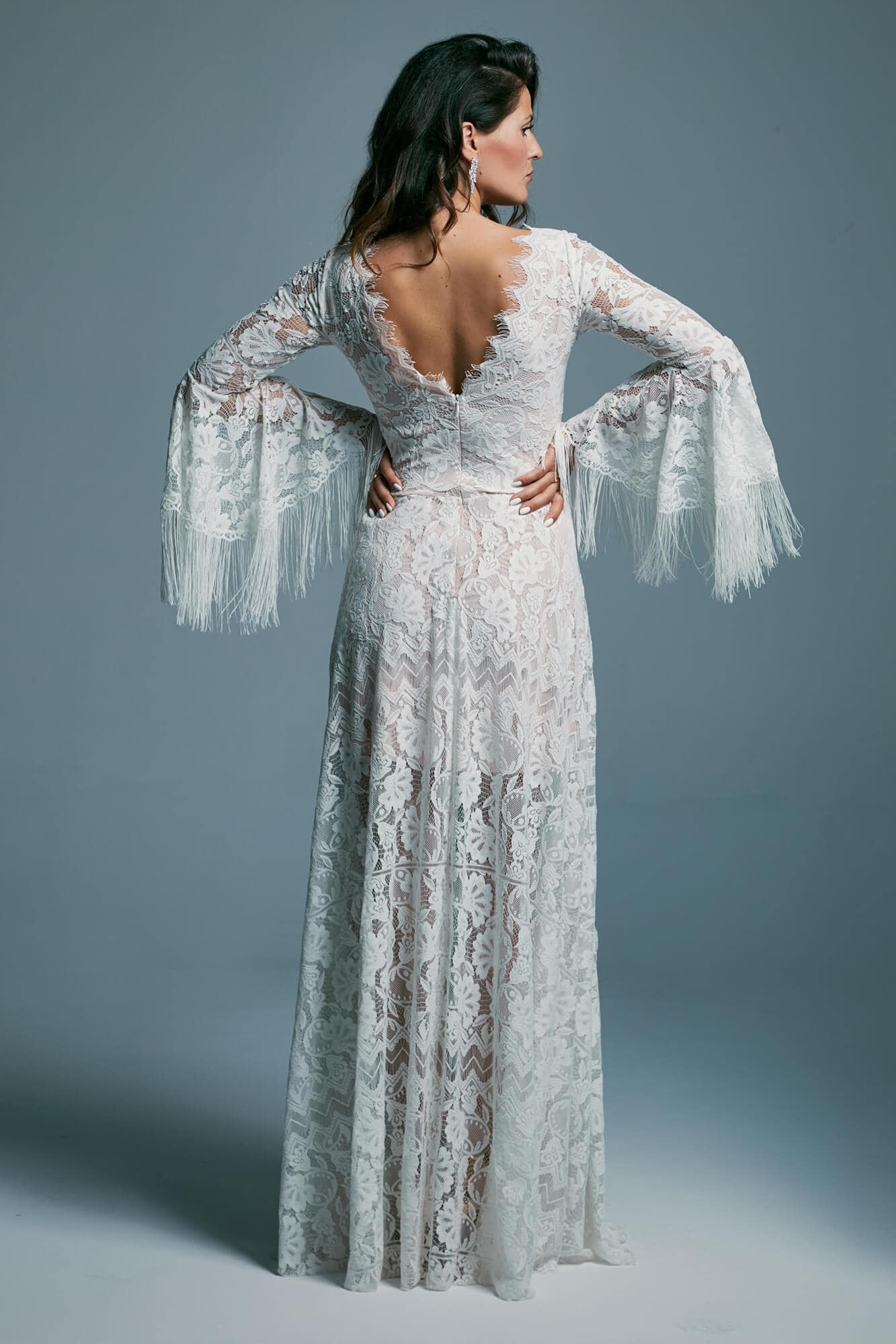Zmierz wysokość tyłu od środka – od najgłębszego punktu dekoltu do talii. Jeśli suknia ma zabudowane plecy lub stójkę, to od najbardziej wystającego kręgu na karku do talii.