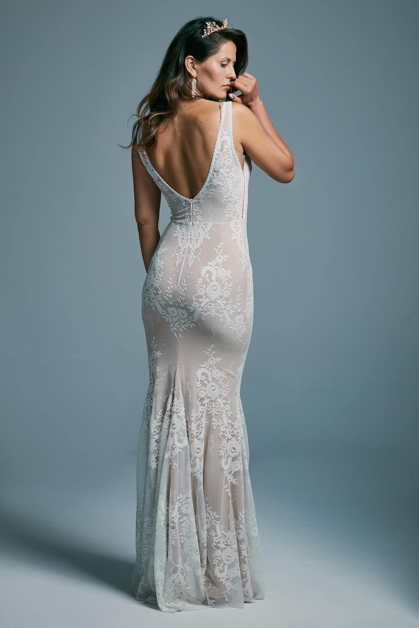 Zmierz wysokość tyłu od środka – od najgłębszego punktu dekoltu do talii. Jeśli suknia ma zabudowane plecy lub stójkę, to od najbardziej wystającego kręgu na karku do talii.