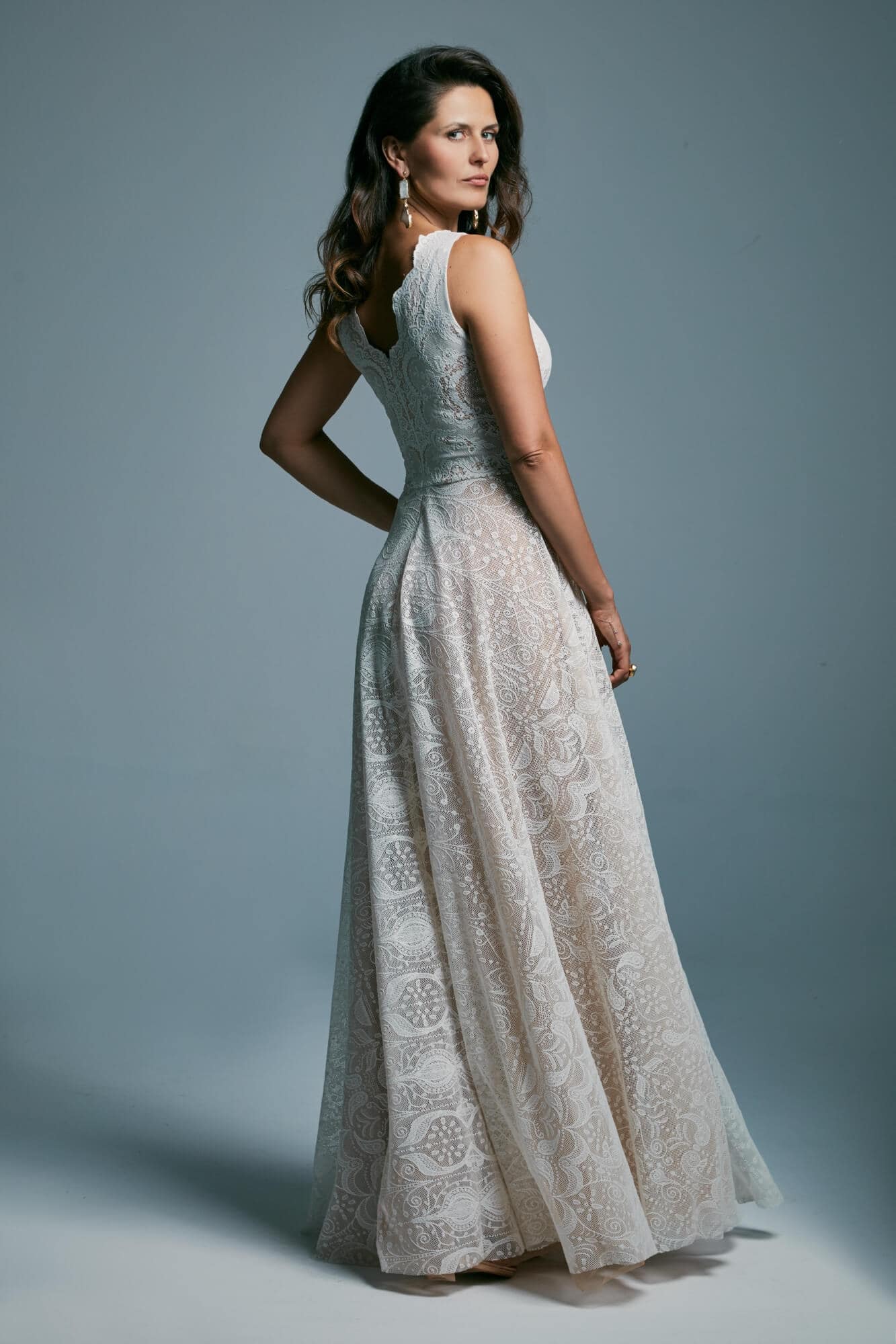 Zmierz wysokość tyłu od środka – od najgłębszego punktu dekoltu do talii. Jeśli suknia ma zabudowane plecy lub stójkę, to od najbardziej wystającego kręgu na karku do talii.