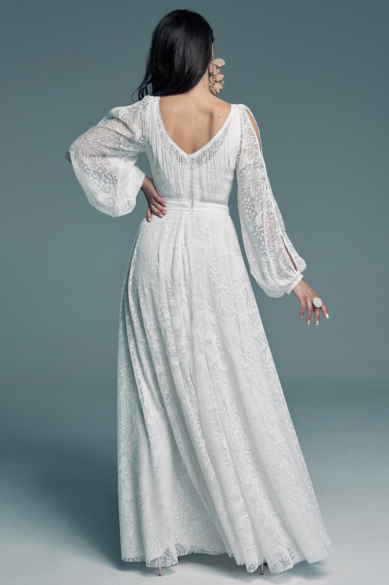 Zmierz wysokość tyłu od środka – od najgłębszego punktu dekoltu do talii. Jeśli suknia ma zabudowane plecy lub stójkę, to od najbardziej wystającego kręgu na karku do talii.