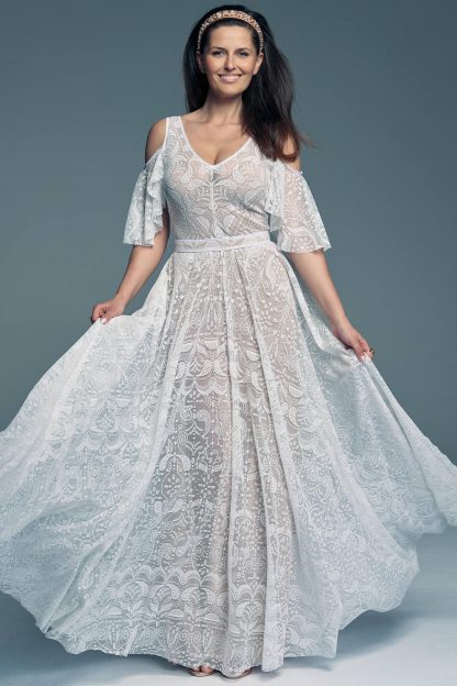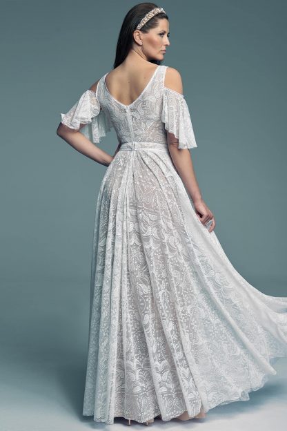 Zmierz połowę dekoltu od środka dekoltu z przodu, do suwaka / kręgosłupa z tyłu, przez rękę, po linię sukienki zsuniętej z ramion.