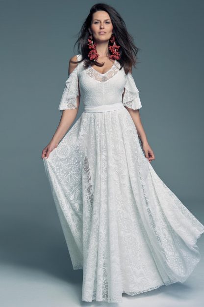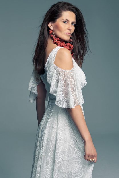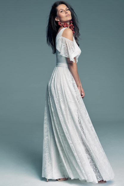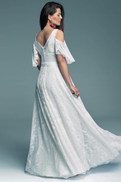 Zmierz połowę dekoltu od środka dekoltu z przodu, do suwaka / kręgosłupa z tyłu, przez rękę, po linię sukienki zsuniętej z ramion.