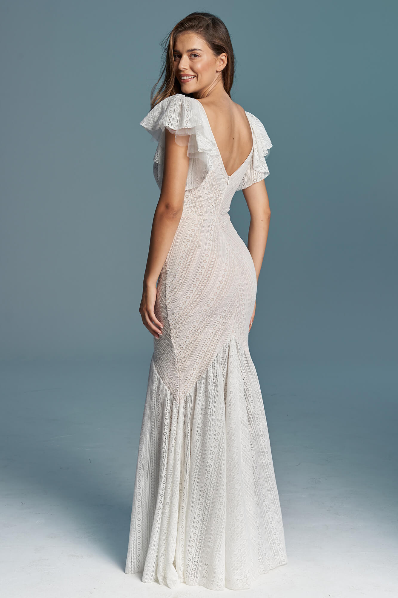 Zmierz wysokość tyłu od środka – od najgłębszego punktu dekoltu do talii. Jeśli suknia ma zabudowane plecy lub stójkę, to od najbardziej wystającego kręgu na karku do talii.