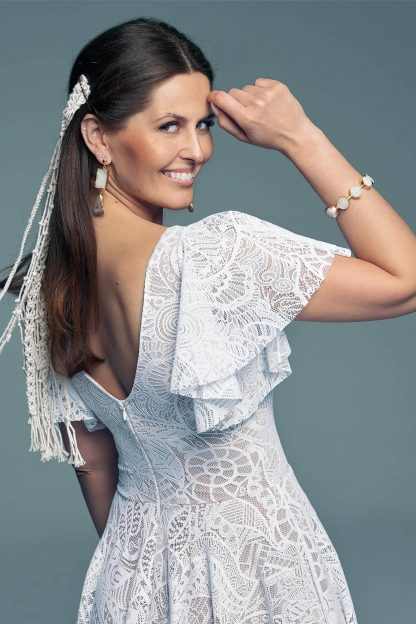 Zmierz wysokość tyłu od środka – od najgłębszego punktu dekoltu do talii. Jeśli suknia ma zabudowane plecy lub stójkę, to od najbardziej wystającego kręgu na karku do talii.