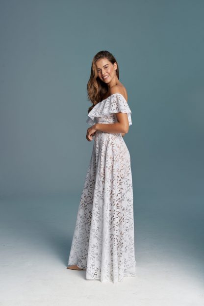 Zmierz połowę dekoltu od środka dekoltu z przodu, do suwaka / kręgosłupa z tyłu, przez rękę, po linię sukienki zsuniętej z ramion.