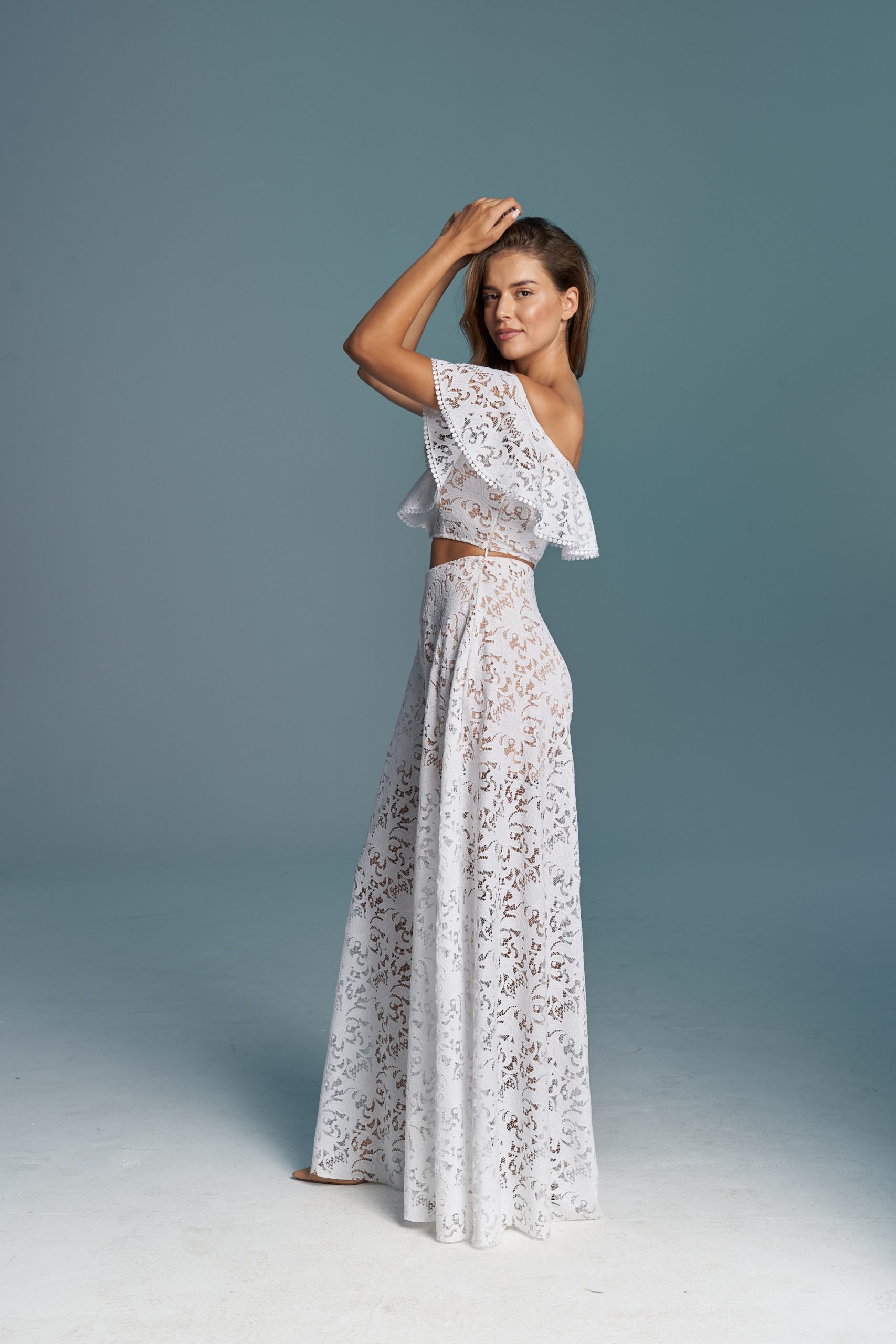 Zmierz długość spódnicy. W tym celu owiń się w talii tasiemką, gumką lub paskiem i poproś kogoś o poprowadzenie miarki od talii do ziemi. Miarę bierz w docelowych butach. Jeśli planujesz je zmienić na niższe lub płaskie to mierz suknię od razu do tych niższych butów – inaczej będziesz się potykać o sukienkę.