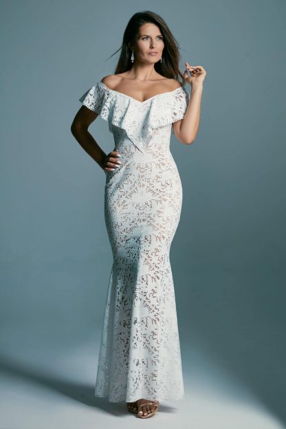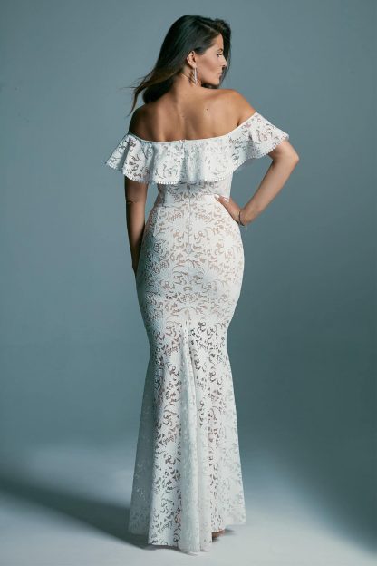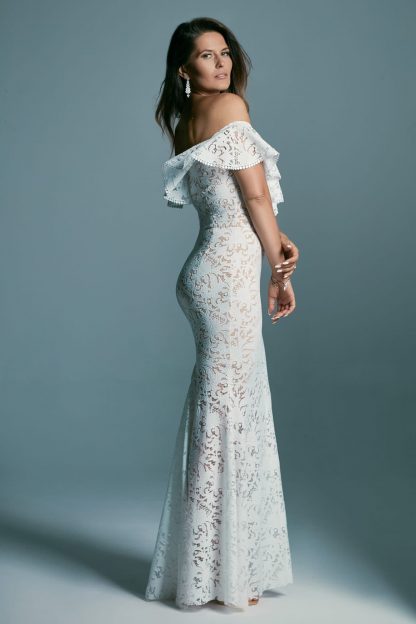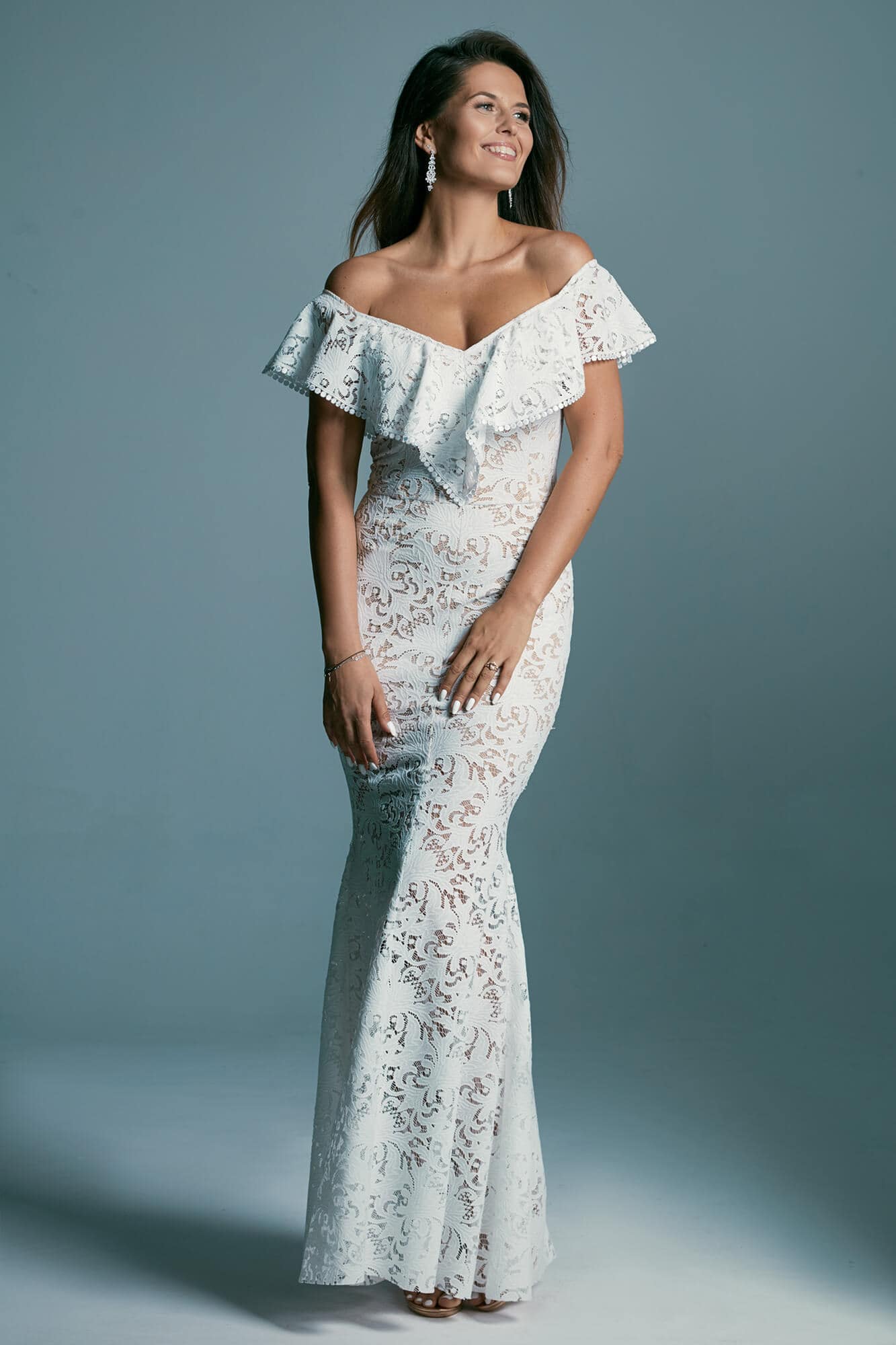 Zmierz połowę dekoltu od środka dekoltu z przodu, do suwaka / kręgosłupa z tyłu, przez rękę, po linię sukienki zsuniętej z ramion.