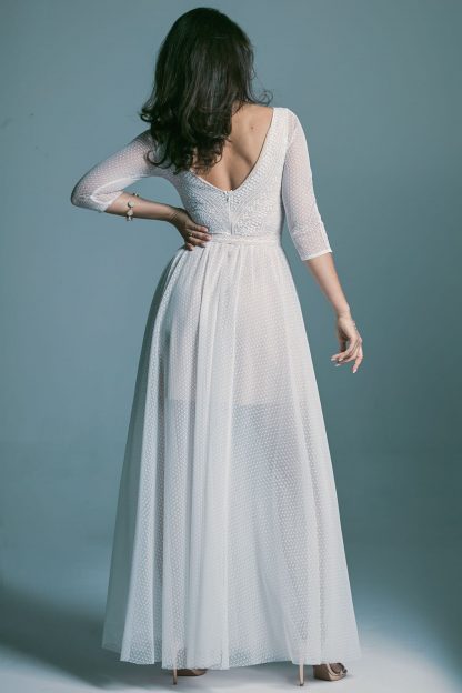 Zmierz obwód ręki (jeśli suknia posiada rękaw) w miejscu gdzie chciałabyś aby kończył się rękaw o długości ¾, czyli nieco pod łokciem.