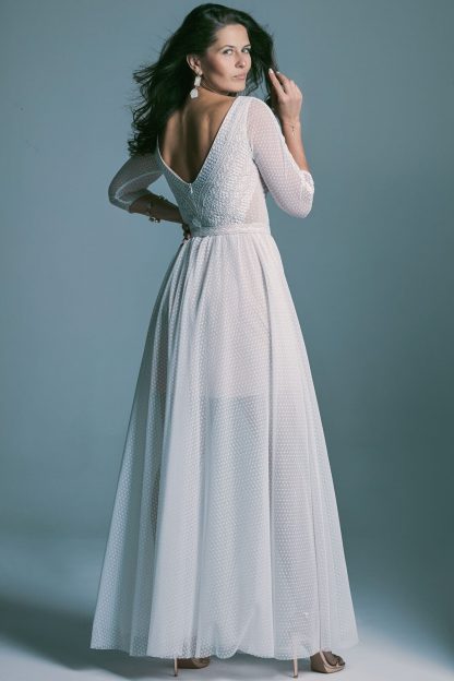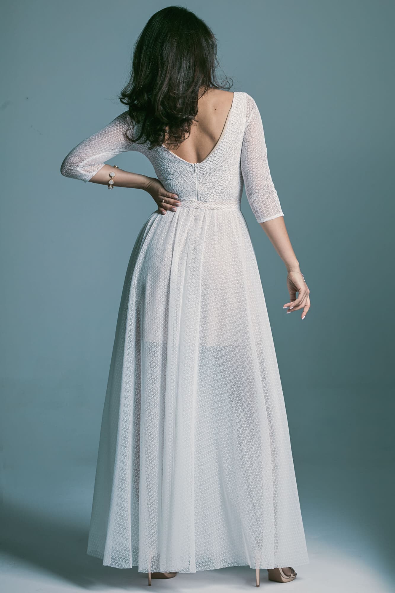 Zmierz połowę dekoltu od środka dekoltu z przodu, do suwaka / kręgosłupa z tyłu, przez rękę, po linię sukienki zsuniętej z ramion.