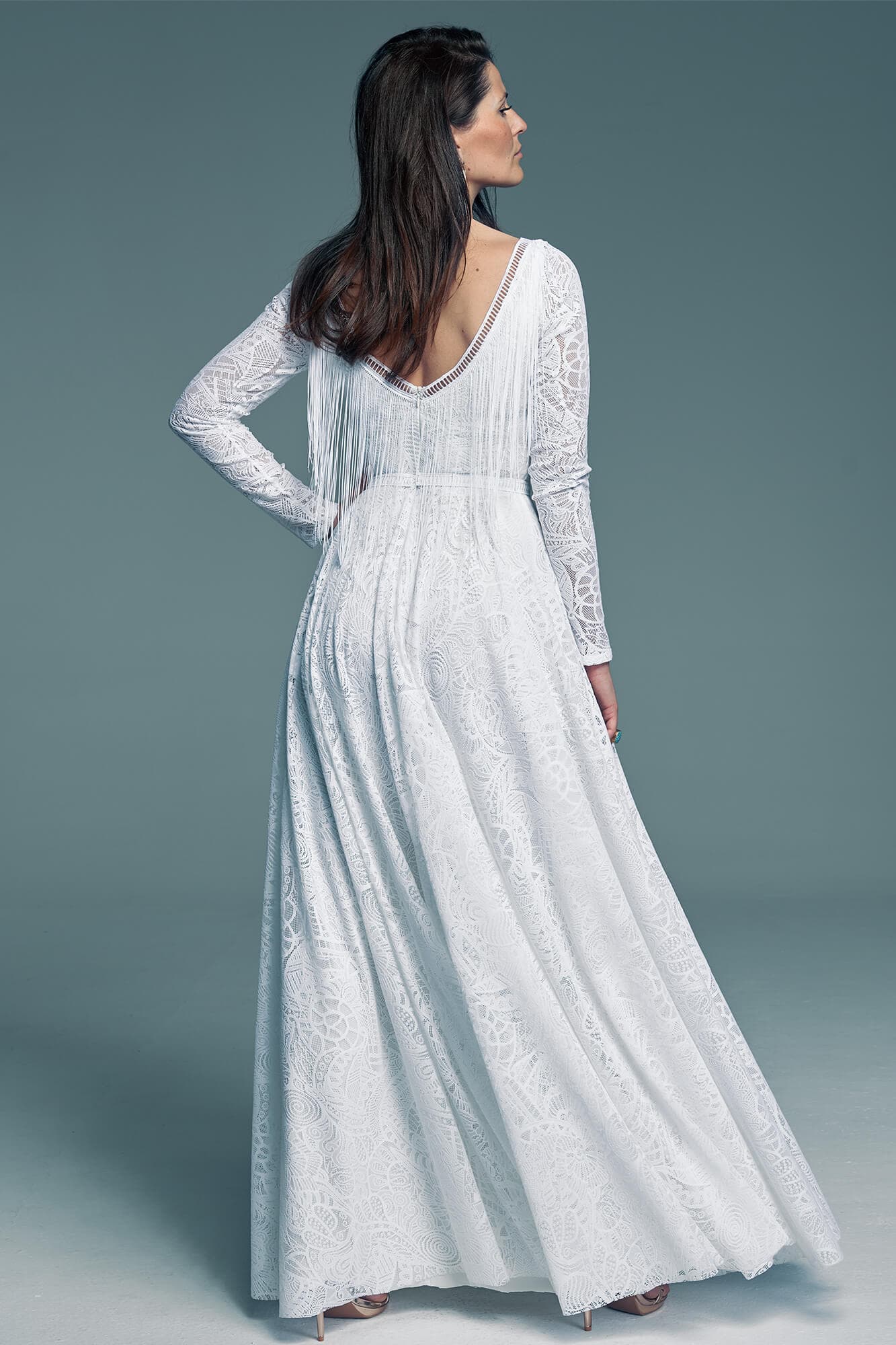 Zmierz wysokość tyłu od środka – od najgłębszego punktu dekoltu do talii. Jeśli suknia ma zabudowane plecy lub stójkę, to od najbardziej wystającego kręgu na karku do talii.